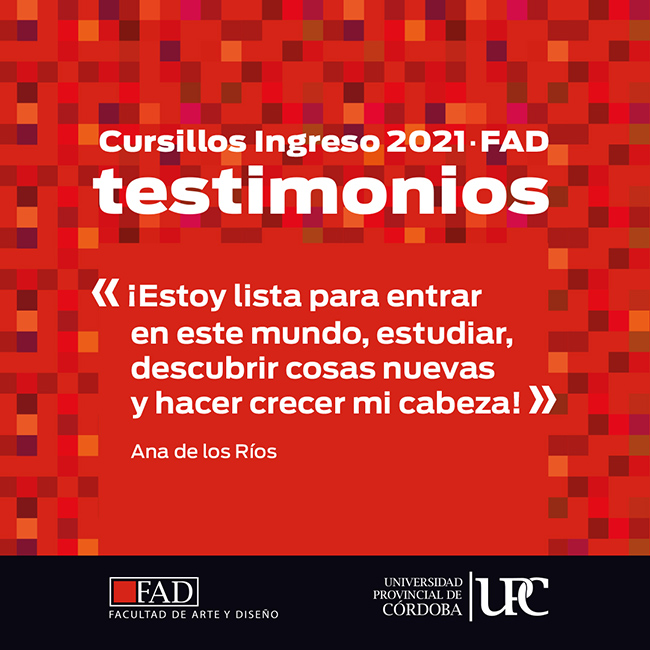 - «¡Hola! Me llamo Ailén, soy de Pilar y tengo 21 años. Me recibí de periodista el año pasado y me gustaría combinar ambas carreras. Me encanta la idea de crear sensaciones o hacer brotar emociones a través de una imagen, por eso decidí empezar esta tecnicatura. »