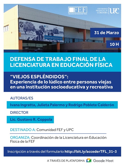 El próximo 31 de marzo, a las 10  horas, se realizará la presentación y defensa del Trabajo Final de la Licenciatura en Educación Física titulado “VIEJOS‌ ‌ESPLÉNDIDOS”:‌ ‌ ‌‌Experiencia‌ ‌de‌ ‌lo‌ ‌lúdico‌ ‌entre‌ ‌personas‌ ‌viejas‌ ‌en‌ ‌una‌ ‌institución‌ ‌socioeducativa‌ ‌y‌ ‌recreativa‌.