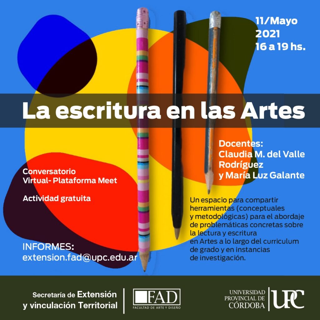 La Facultad de Arte y Diseño de la Universidad Provincial de Córdoba (UPC) a través de la Secretaría de Extensión y vinculación Territorial, invita a la Cátedra Abierta: «La escritura en Artes. »