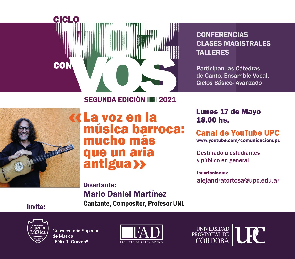 “La voz en la música barroca: mucho más que un aria antigua” y contará con la presencia del disertante: Mario Daniel Martínez, cantante, compositor, profesor titular de la cátedra de canto del Instituto superior de música de la Facultad de humanidades y Ciencias UNL.