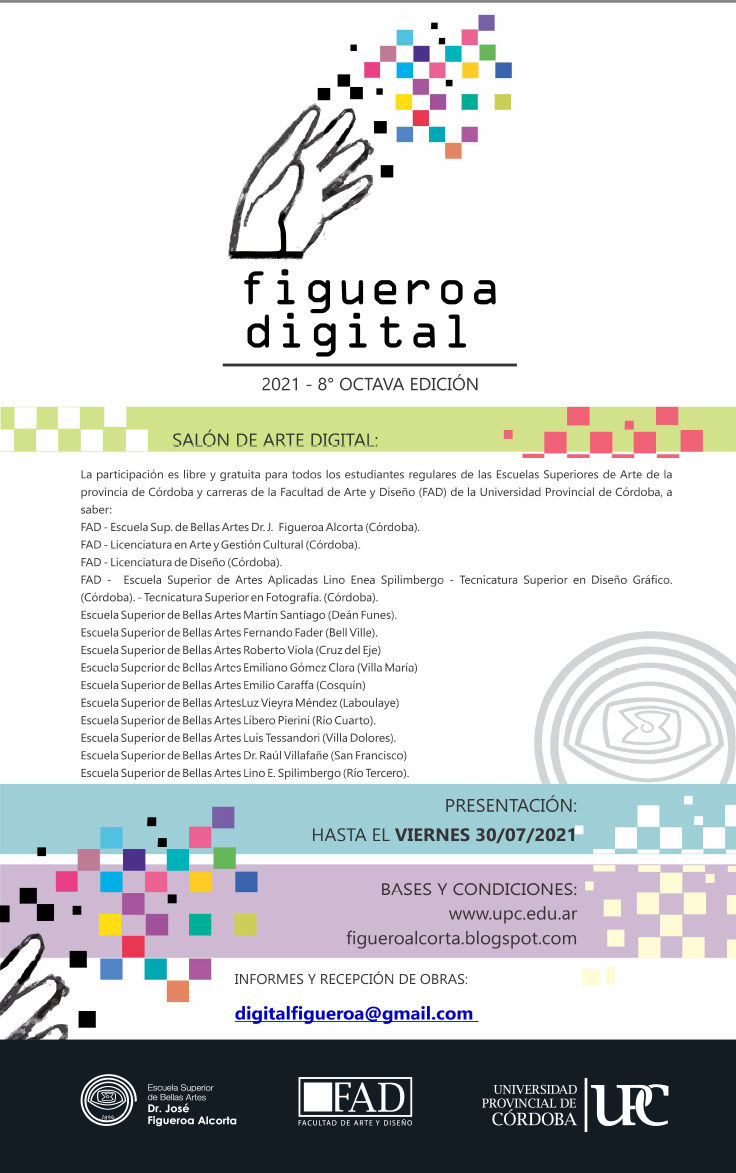 La Facultad de Arte y Diseño de la Universidad Provincial de Córdoba (FAD- UPC), a través de su Escuela Superior de Bellas Artes Dr. José Figueroa Alcorta y en el marco de las actividades de Extensión y Producción 2021, invitan a participar de la 8° Edición Salón FIGUEROA DIGITAL.