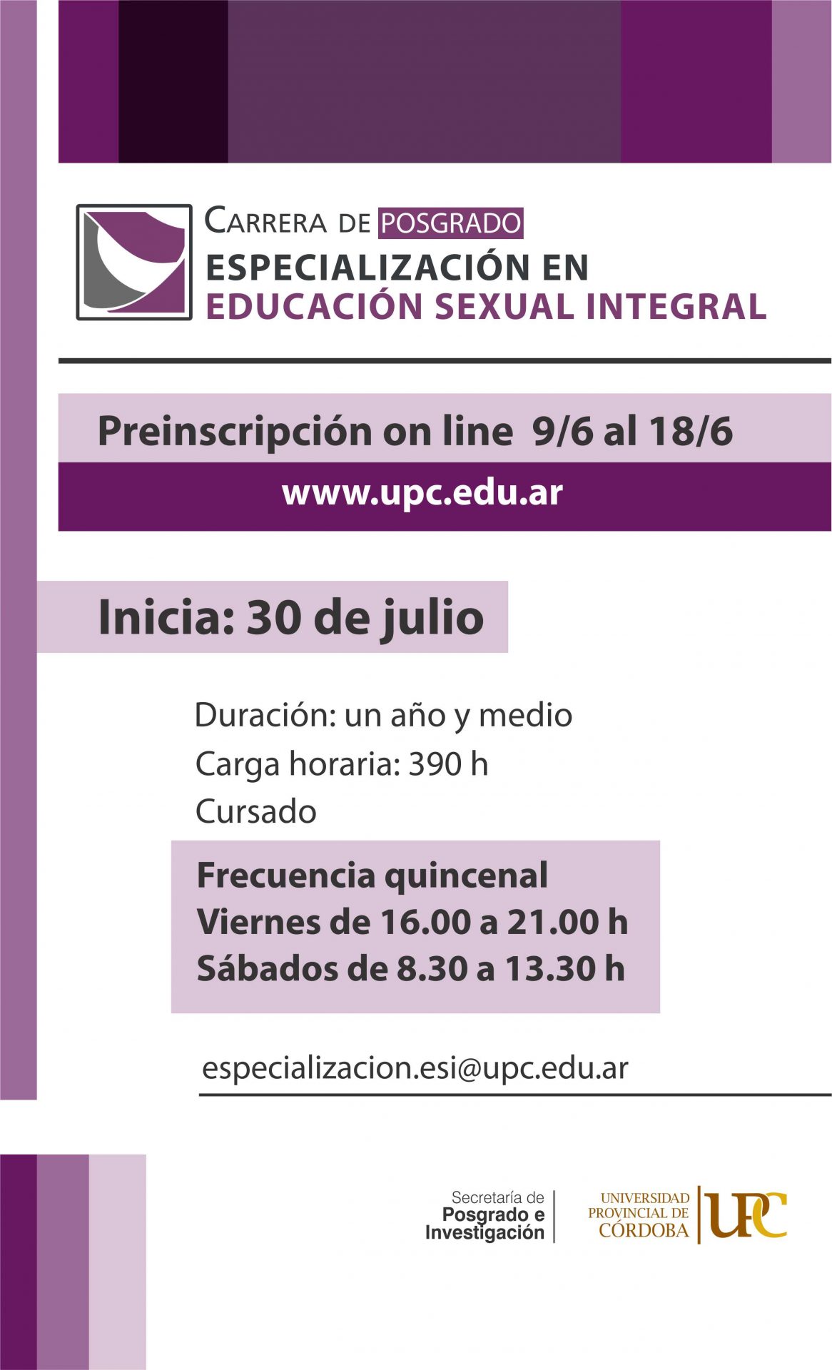 - Cursado: Frecuencia quincenal. Viernes de 16.00 a 21.00 h y sábados de 8.30 a 13.30 h.