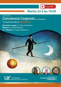 La Secretaría de Asuntos Estudiantiles y Graduados de la Universidad Provincial de Córdoba invita a los y las estudiantes a participar de la Segunda charla-debate sobre la consciencia corporal a cargo de Andrea Eva Luna Navarre, docente de esta casa de estudios.