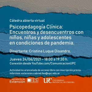 La Facultad de Educación y Salud de la Universidad Provincial de Córdoba invita a la Cátedra abierta virtual: Psicopedagogía Clínica: Encuentros y desencuentros con niños, niñas y adolescentes en condiciones de pandemia. La misma se desarrollará el próximo jueves 24 de junio a las 18:00, sin costo y con acceso libre.