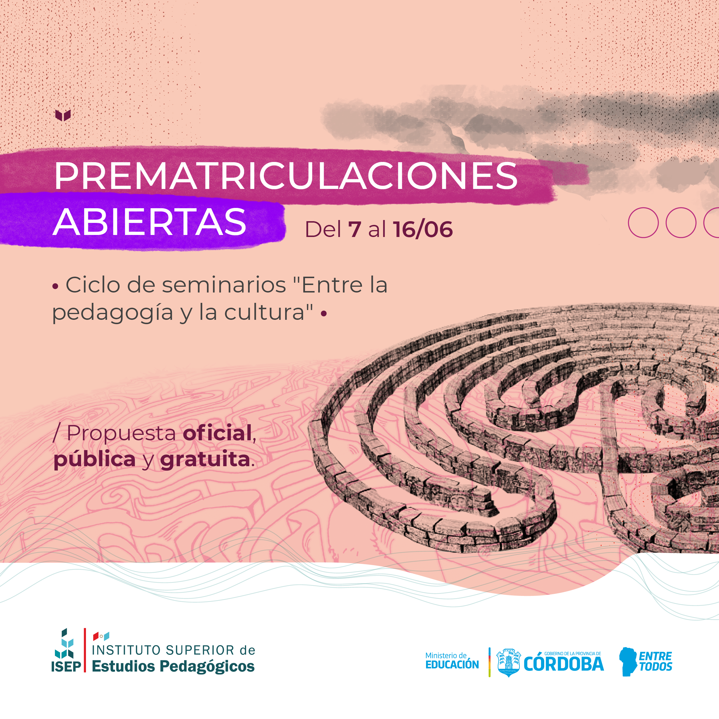 La Universidad Provincial de Córdoba informa que hasta el jueves 17 de junio inclusive permanecerá abierto el periodo de prematriculación para los seminarios pertenecientes al Ciclo “Entre la Pedagogía y la Cultura”, organizados por el Instituto Superior de Estudios Pedagógicos (ISEP).
