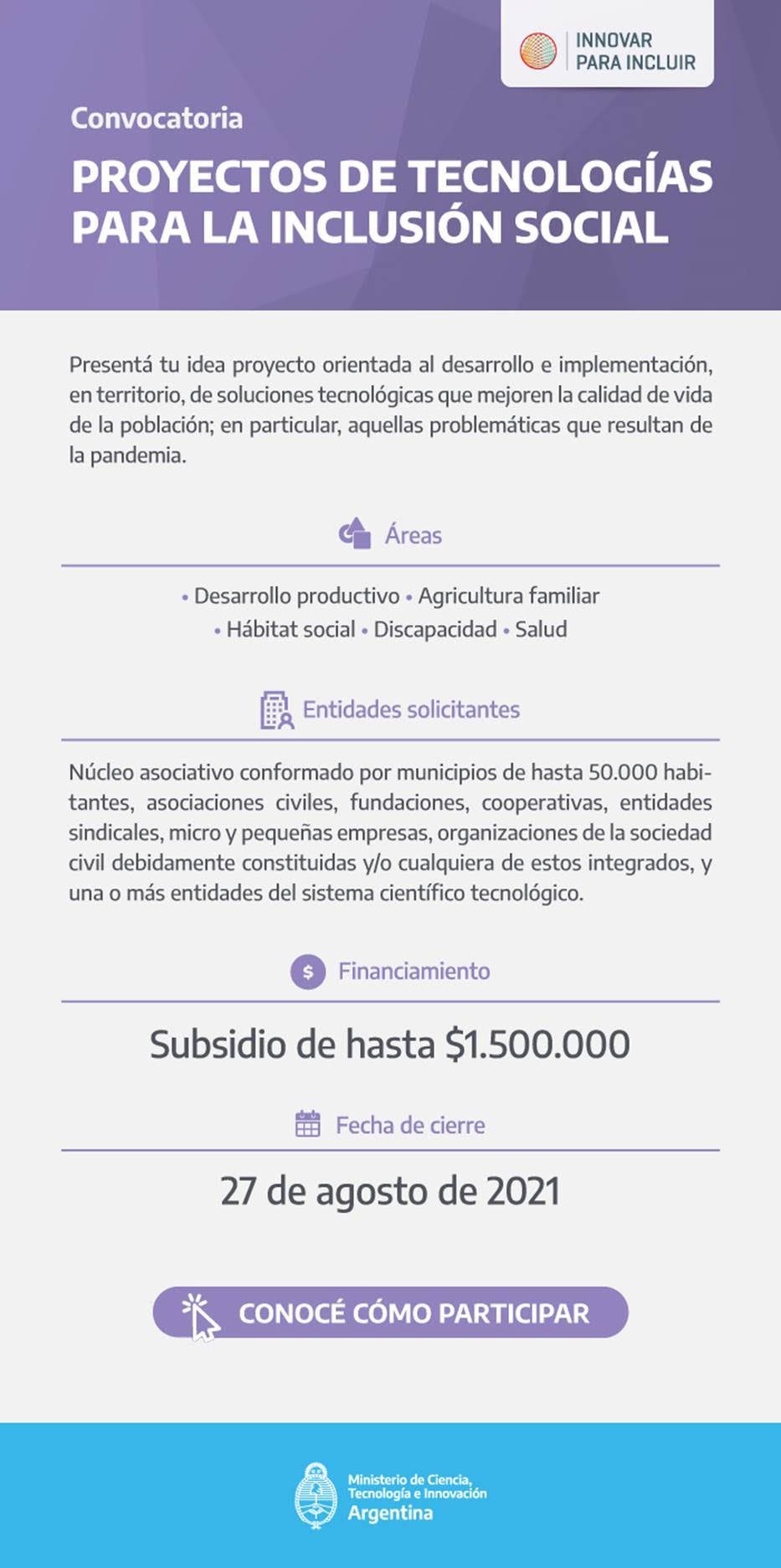 El objetivo es promover dinámicas de innovación entre actores sociales y entidades del Sistema Nacional de Ciencia, Tecnología e Innovación (SNCTI) a fin de generar nuevas modalidades de resolución de problemáticas sociales o productivas.