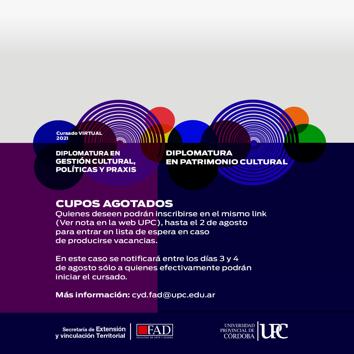 La Facultad de Arte y Diseño de la Universidad Provincial de Córdoba, desde el Área Cursos y Diplomaturas, informa que con fecha 5 de julio se ha cubierto el cupo para inscripciones en las Diplomaturas que inician en agosto 2021: