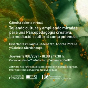 El concepto de Mediación Cultural refiere, entre otros, al de conversación. Una forma particular de comunicación que tiene que ver con aprender produciendo, observando, participando, explorando, jugando. Entendemos la Mediación Cultural como un intercambio de saberes entre diversos lenguajes, entre obra y espectador, entre objetos y educación de la memoria, entre historia y construcción de futuro, entre políticas y poéticas; desde territorios situados que habiliten encuentros, diálogos, escuchas y debates. Ello implica “Interdisciplina” entre diversos profesionales y equipos que investigan, preparan y ofrecen diversas propuestas e intervenciones, para que dialoguen todos los lenguajes (plásticos, literarios, corporales, sonoros, diversas lenguas, etc.) abriendo a experiencias diversas para amplios públicos.