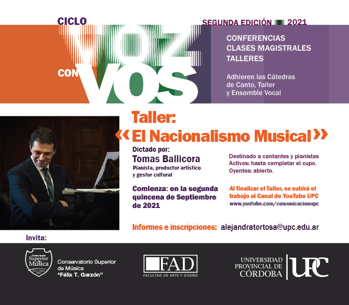 En esta oportunidad se trata de un TALLER que se titula: «El Nacionalismo musical» y será dictado por: Tomás Ballicora. Pianista, productor artístico y gestor.