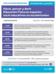 – 19/08 – 18 a 20 horas: «Intervenciones de profesoras/es de Educación Física en diversos espacios socio educativos», a cargo de Ricardo Crisorio (Cices IDHICS).