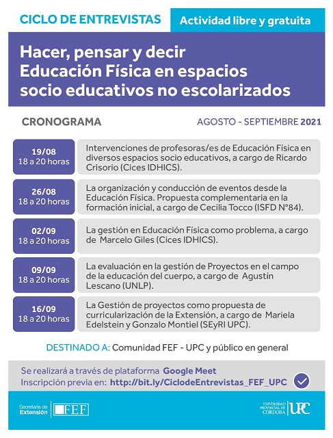 La Secretaría de Extensión y Relaciones Institucionales de la Facultad de Educación Física de la Universidad Provincial de Córdoba invita a participar del ciclo de entrevistas «Hacer, pensar y decir Educación Física en espacios socio educativos no escolarizados».