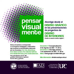 La Facultad de Arte y Diseño de la Universidad Provincial de Córdoba, -desde la ESAA Lino Enea Spilimbergo-, invitan a los dos Conversatorios denominados: “Pensar visualmente”. Abordaje desde el Diseño Gráfico en las presentaciones de proyectos de Diseño de Interiores.