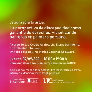 En el marco de la Unidad Curricular Historia y Perspectiva de la Educación especial de 1er año del Profesorado Universitario de Educación Especial de la Facultad de Educación y Salud Dr. Domingo Cabred (FES) y como parte constitutiva de la propuesta de cátedra, se ofrecen espacios con proyección social destinados al público en general y estudiantes en formación docente en particular para abordar, profundizar y poner en debate conceptos claves con perspectiva de Derechos humanos de las personas con discapacidad en el marco de la legislación vigente en Argentina y el mundo.