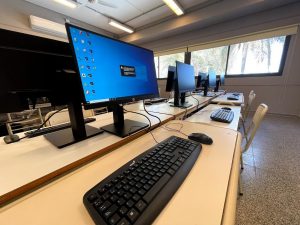 Computadoras de alto rendimiento gráfico, monitores de tecnología led con plataformas regulables, un potente proyector y una pantalla de proyección retractil son los principales atractivos de la sala destinada a incubar los proyectos artísticos atravesados por la tecnología.