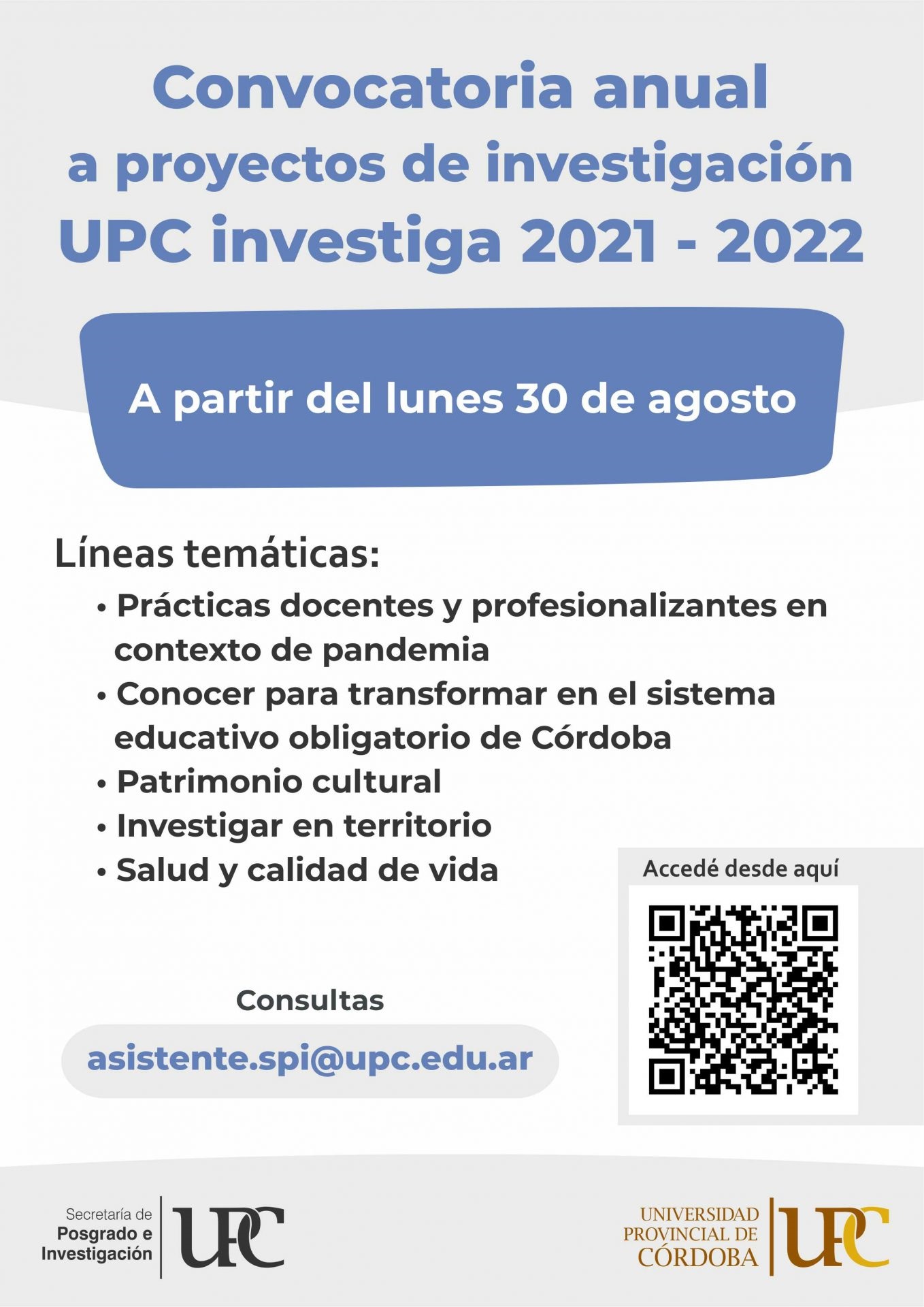 La Secretaría de Posgrado e Investigación de la Universidad Provincial de Córdoba informa la prórroga hasta el próximo miércoles 29 de septiembre hasta el mediodía (12 h) en la convocatoria para la presentación de proyectos de investigación “UPC investiga 2021-2022”, tras una falla en el sistema, ajeno a nuestra universidad y que afecta a nuestro SIGEVA UPC.