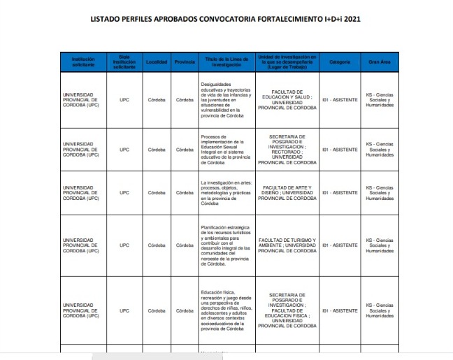 LISTADO PERFILES APROBADOS CONVOCATORIA FORTALECIMIENTO I+D+i 2021 de la UPC:
