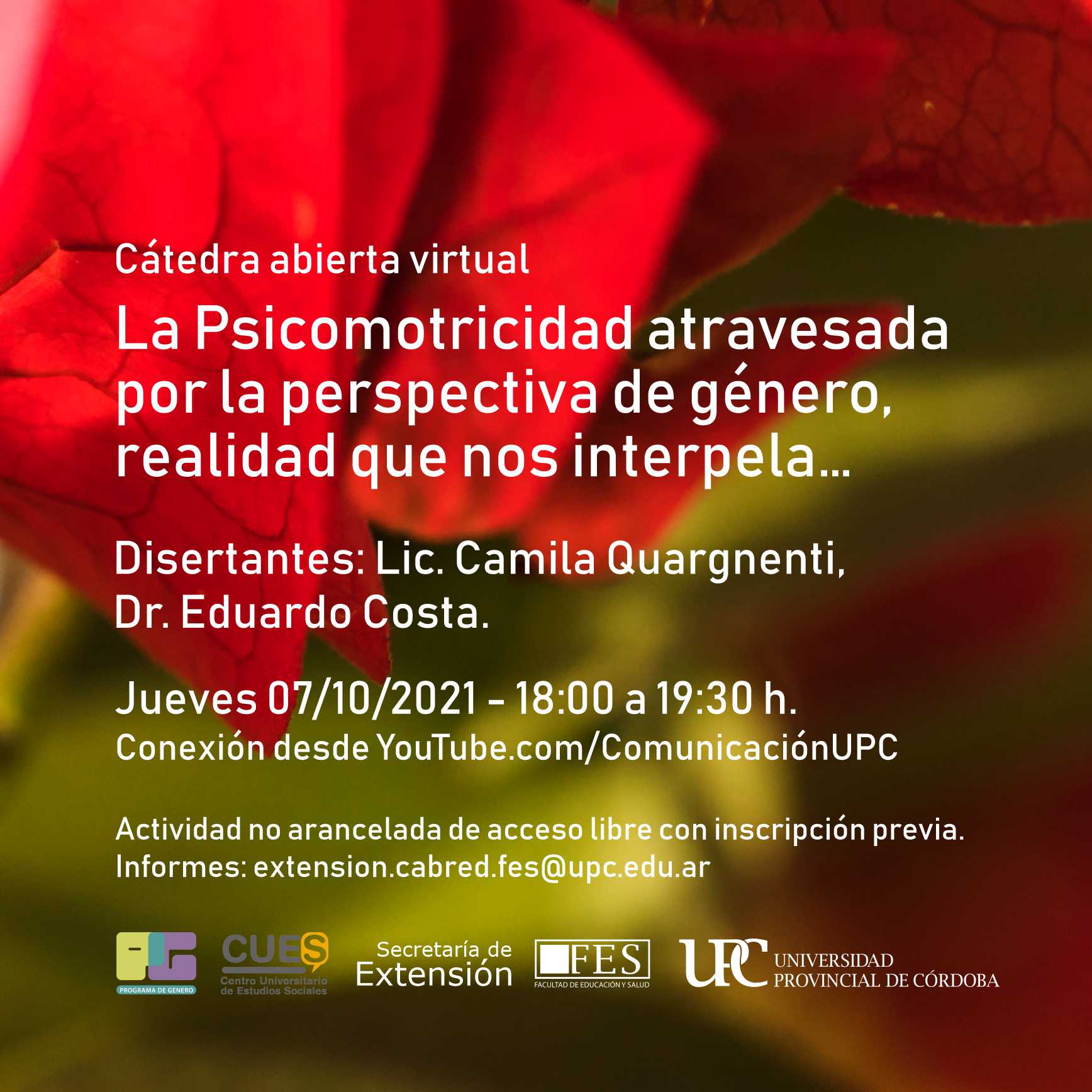 La Facultad de Educación y Salud de la Universidad Provincial de Córdoba invita a la Cátedra abierta virtual, La Psicomotricidad atravesada por la perspectiva de género, realidad que nos interpela… La misma se desarrollará el próximo jueves 7 de octubre a las 18:00, sin costo y con acceso libre. La actividad estará a cargo de la Licenciada Camila Quargnenti y del Doctor Eduardo Costa.