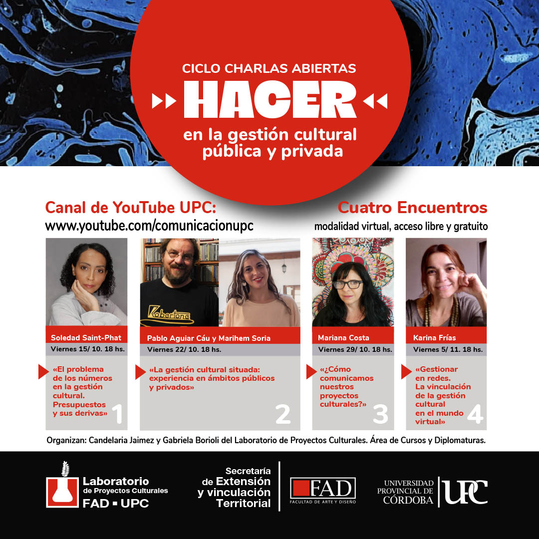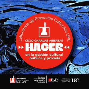 La Facultad de Arte y Diseño de la Universidad Provincial de Córdoba, desde el Laboratorio de Proyectos culturales, presenta e invita al Ciclo de charlas abiertas: El hacer en la Gestión pública y privada.