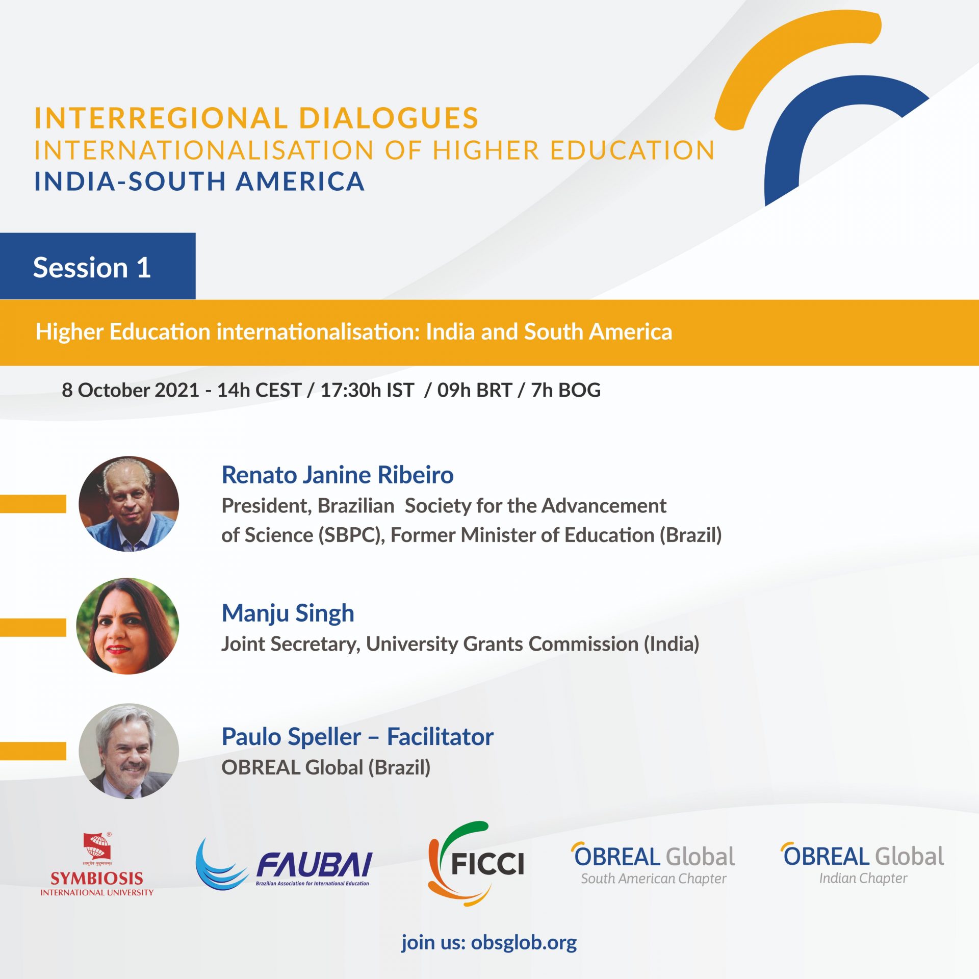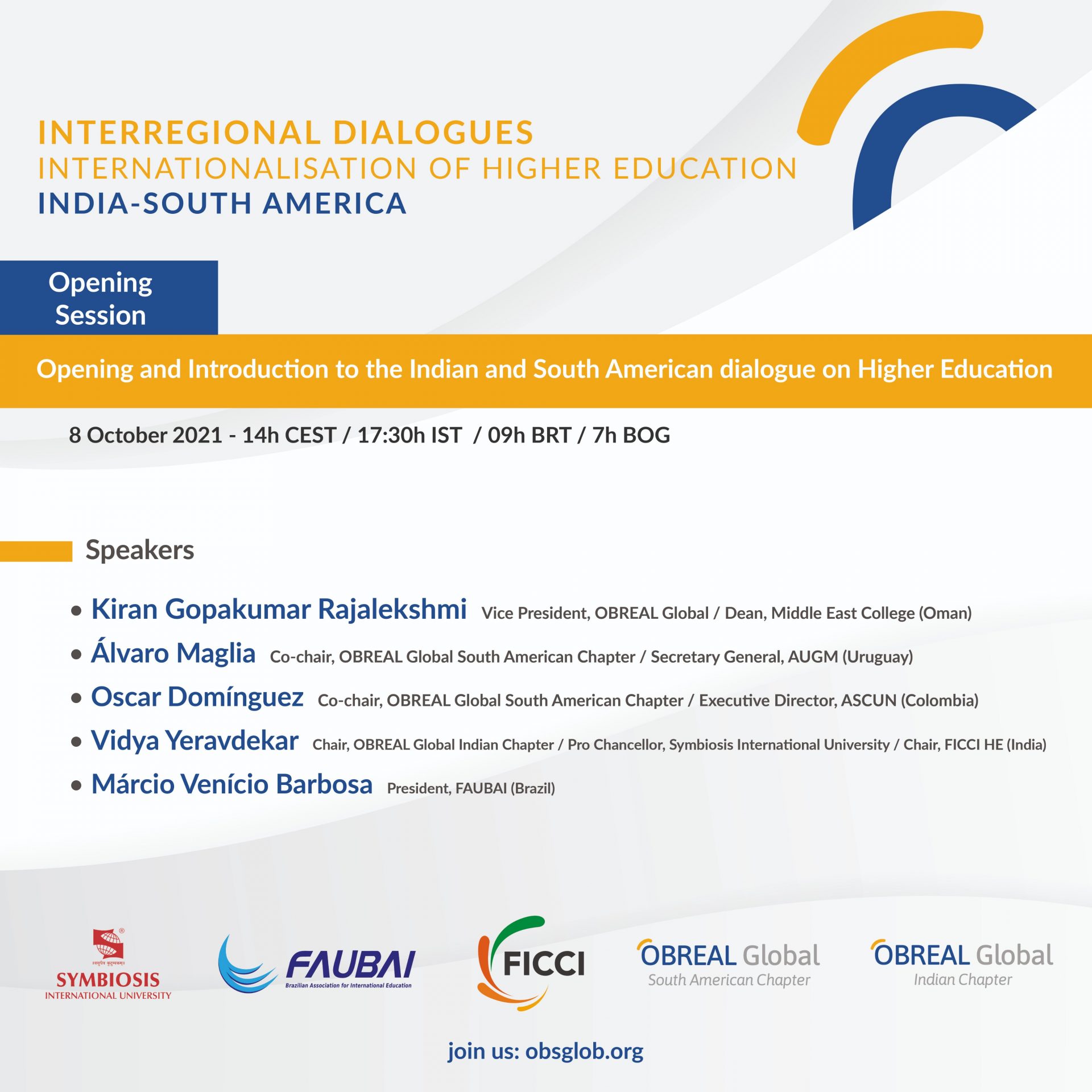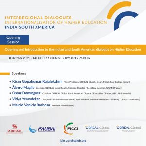 Este evento es organizado por OBREAL Global junto con la Associação Brasileira de Educação Internacional (FAUBAI) y Symbiosis International University, quienes en el marco de una nueva serie de Diálogos Interregionales de OBREAL Global, proponen una serie de actividades cuyo objetivo es conectar a socios de diferentes regiones del mundo y explorar temas de interés común para la educación superior desde una perspectiva interregional.