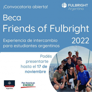 El programa Friends of Fulbright facilita experiencias de intercambio para que estudiantes universitarios argentinos asistan a clases, seminarios y actividades de inmersión cultural en universidades estadounidenses. Este programa cuenta con el apoyo de la Embajada de los Estados Unidos y Pan American Energy.