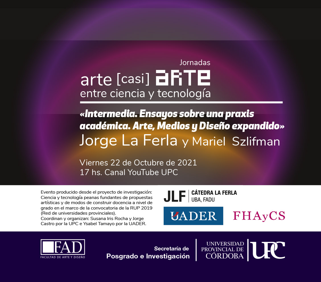El Título de la disertación es: “Intermedia. Ensayos sobre una praxis académica. Arte, Medios y Diseño expandido” y estará a cargo de Jorge Ferla y Mariel Szlifman.