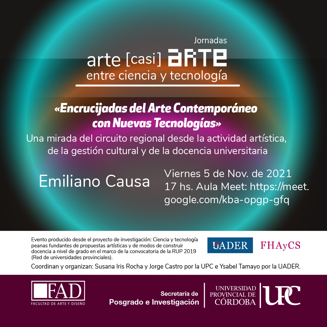 El Título de la disertación es:  “Encrucijadas del Arte Contemporáneo con Nuevas Tecnologías. Una mirada del circuito regional desde la actividad artística, de la gestión cultural y de la docencia universitaria” y estará a cargo de Emiliano Causa.