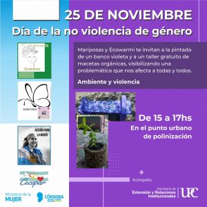 Asimismo, desde la Secretaría de Extensión y Relaciones Institucionales invitamos también el jueves 25 de noviembre a la acción de pintada de color violeta en conmemoración a las victimas de violencia de género y un taller de macetas orgánicas. La actividad tiene por objetivo visibilizar esta problemática que nos afecta a todes, y se desarrollará de 15 a 17 en el punto urbano de polinización.