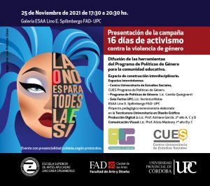 Invitamos a conocer el proceso y los trabajos de estudiantes que se darán a conocer el 25 de noviembre de 2021, de 17,30 hs. a 20,30 hs., en la Galería de la ESAA Lino E. Spilimbergo de la FAD- UPC, con presencialidad y protocolos sanitarios garantizados. Luego de esa jornada se desarrollarán, a lo largo de los 16 días de activismo, una pegatineada en cada uno de los espacios físicos de la UPC, con la campaña de concientización desarrollada por les estudiantes, acción que se podrá seguir en las redes oficiales de esta casa de estudios. Al finalizar la acción global de activismo, se dará a conocer una galería virtual donde los trabajos desarrollados quedarán exhibidos y a disposición para el uso colectivo.