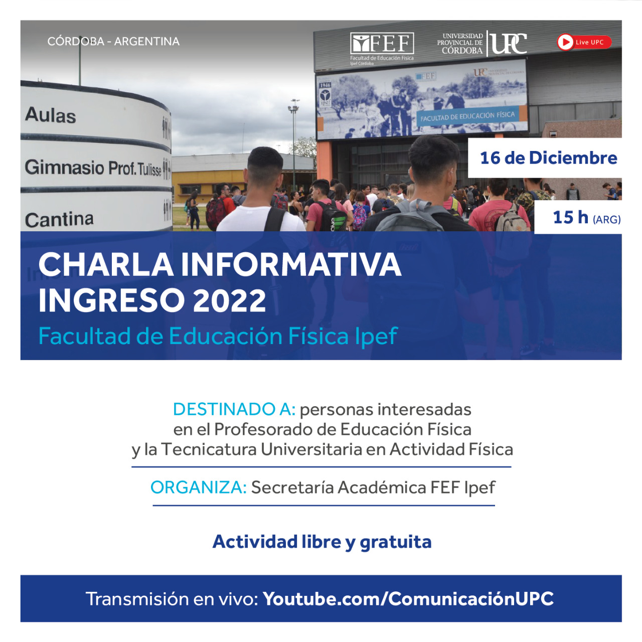 Durante el encuentro se brindará información sobre: el ingreso 2022 a las carreras de la FEF Ipef, el proceso de inscripción, la documentación a presentar, los requisitos académicos, las modalidades de cursado, entre otras.