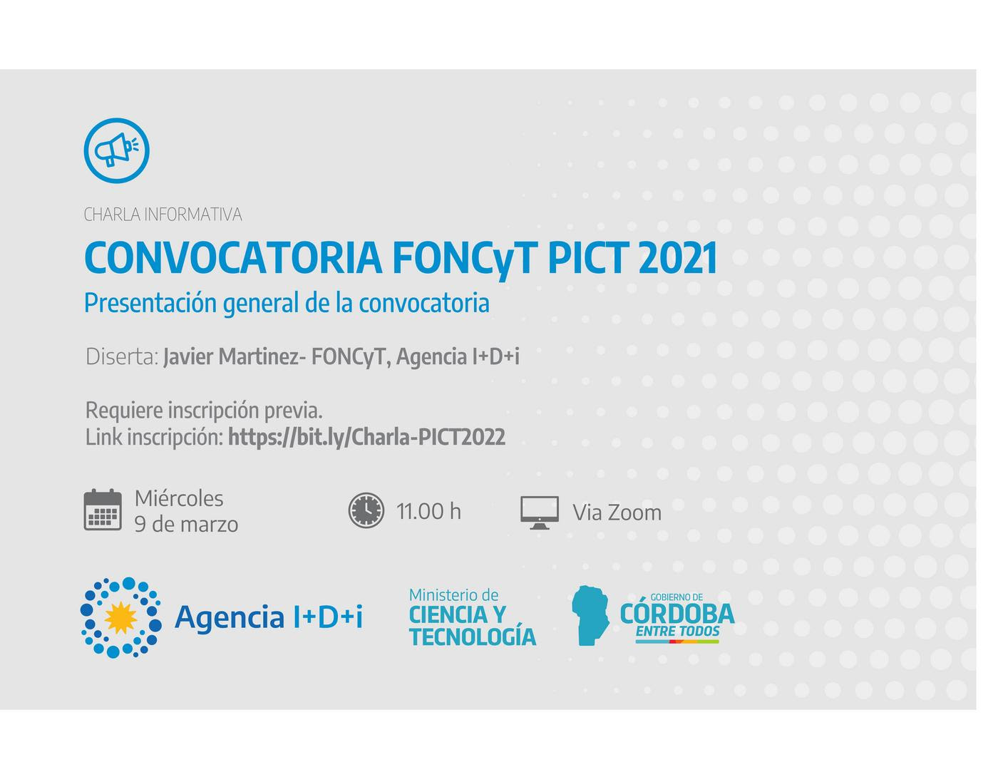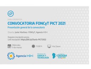 La Secretaría de Posgrado e Investigación de la Universidad Provincial de Córdoba invita a participar de la charla informativa sobre la Convocatoria Proyectos de Investigación Científica y Tecnológica (PICT) dependiente de la Agencia Nacional de Promoción de la Investigación, el Desarrollo Tecnológico y la Innovación (AGENCIA I+D+i), a través del Fondo para la Investigación Científica y Tecnológica (FONCyT).