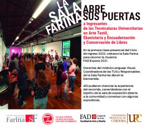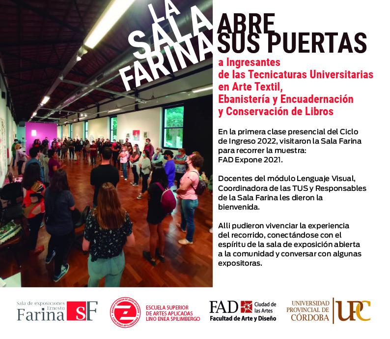 Se realizó la primera clase presencial del Ciclo de Ingreso a los Estudios Universitarios de las Tecnicaturas Universitarias en Arte Textil, Ebanistería y Encuadernación y Conservación de Libros, de 2022, se abordaron conceptos y experiencias sobre el Lenguaje Visual de las disciplinas artísticas. Los aspirantes a las tres carreras visitaron junto a sus docentes la Sala Farina para recorrer la muestra FAD Expone 2021. Allí pudieron vivenciar la experiencia del recorrido, conectarse con el espíritu de la sala de exposición abierta a la comunidad, conversar con algunas expositoras, adentrarse en el mundo del las artes visuales y los lenguajes artísticos a través de la experiencia directa.