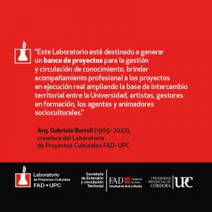 El Laboratorio de Proyectos Culturales Creado en 2020  por la Arq. Gabriela Borioli , Extensión de la UPC y el área de Cursos y Diplomaturas de la FAD, está destinado a generar un banco de proyectos para la gestión y circulación de conocimiento, brindar acompañamiento profesional a los proyectos en ejecución real ampliando la base de intercambio territorial entre la Universidad, artistas y gestores en formación y los agentes y animadores socioculturales.