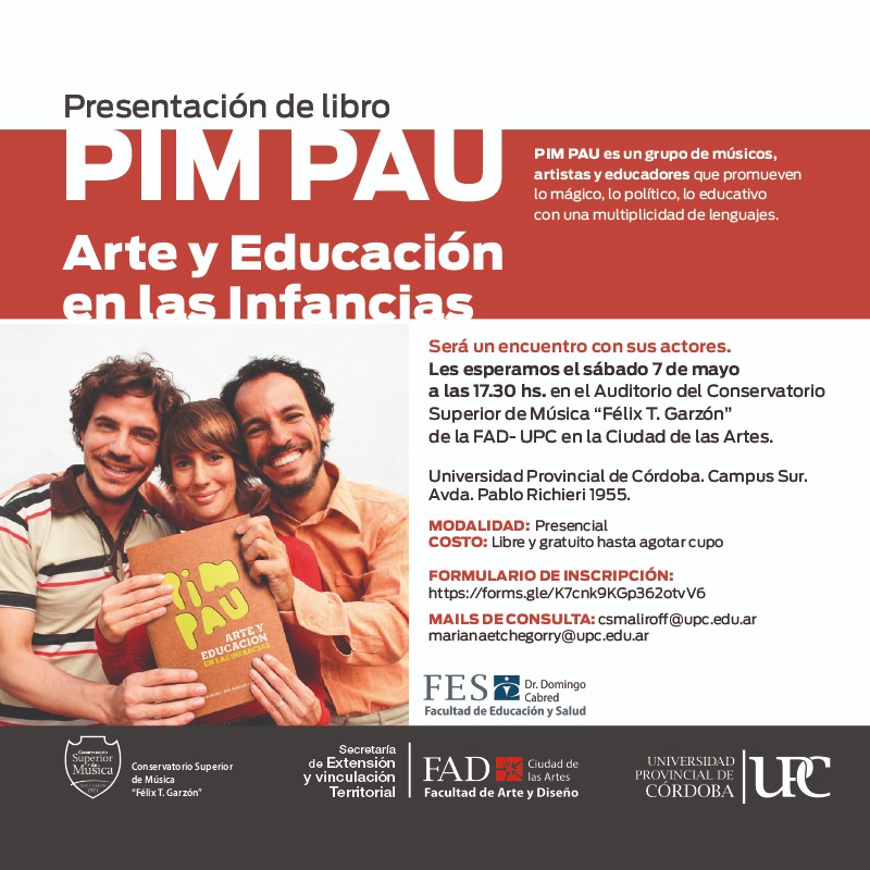 Como equipos de cátedras de la Licenciatura en Psicopedagogía Práctica V, Taller de Expresión Creativa y equipos del Profesorado Universitario de Música desde los espacios curriculares: Producción Artística, Lenguaje Musical en el Aula, Psicología en la Educación Artística, ESI y en articulación con el Proyecto de Extensión “Un mundo por contar”, es un honor esta invitación que compartimos con estudiantes, docentes, y comunidad en general; ya que estamos trabajando en pos del enriquecimiento cultural de las infancias y de los profesionales que se ocupan de ella. En el marco de este trabajo colectivo, identificamos algunas propuestas de la provincia y el país que son especialmente valiosas. En éste marco quedan todos, todas, todes invitadxs a compartir con PIM PAU, los autores de la presentación de éste aporte en formato de libro editado en el 2021.