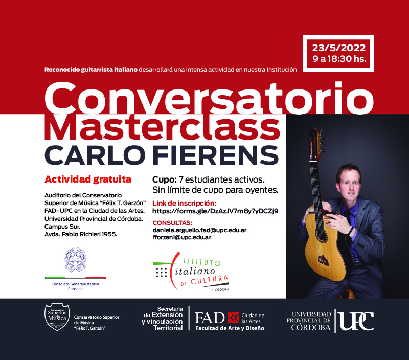 Este evento está destinado a docentes y alumnos de guitarra en particular, abierto a instrumentistas en general, el Maestro Carlo Fierens comenzará sus actividades con un Conversatorio donde abordará diferentes temas que atañen a su vida profesional como guitarrista. A posteriori se desarrollarán clases magistrales para alumnos avanzados de guitarra habiéndose establecido un cupo de 7 alumnos activos. En caso de superar dicho número un tribunal de docentes de nuestra institución realizará una preselección, por lo que la inscripción para postulantes activos cerrará el 15 de mayo; permaneciendo abierta para alumnos oyentes hasta el mismo 23 de mayo. Cabe destacar que gracias al patrocinio del Instituto italiano de Cultura dichas actividades serán gratuitas tanto para activos como para oyentes. Sin duda, una excelente oportunidad para aprender y disfrutar de la experiencia y trayectoria del maestro Fierens.