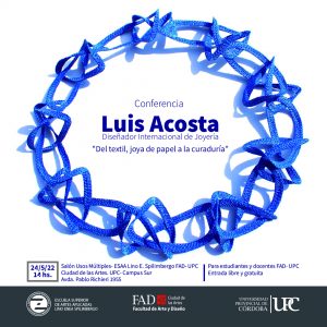 La Facultad de Arte y Diseño y la ESAA Lino E. Spilimbergo de la Universidad Provincial de Córdoba invitan a la Conferencia de Luis Acosta: Diseñador Internacional de Joyería. «Del textil, joya de papel a la curaduría». Un viaje desde sus orígenes como artista textil hasta el presente como diseñador de joyas textiles de papel y curador de exposiciones internacionales.