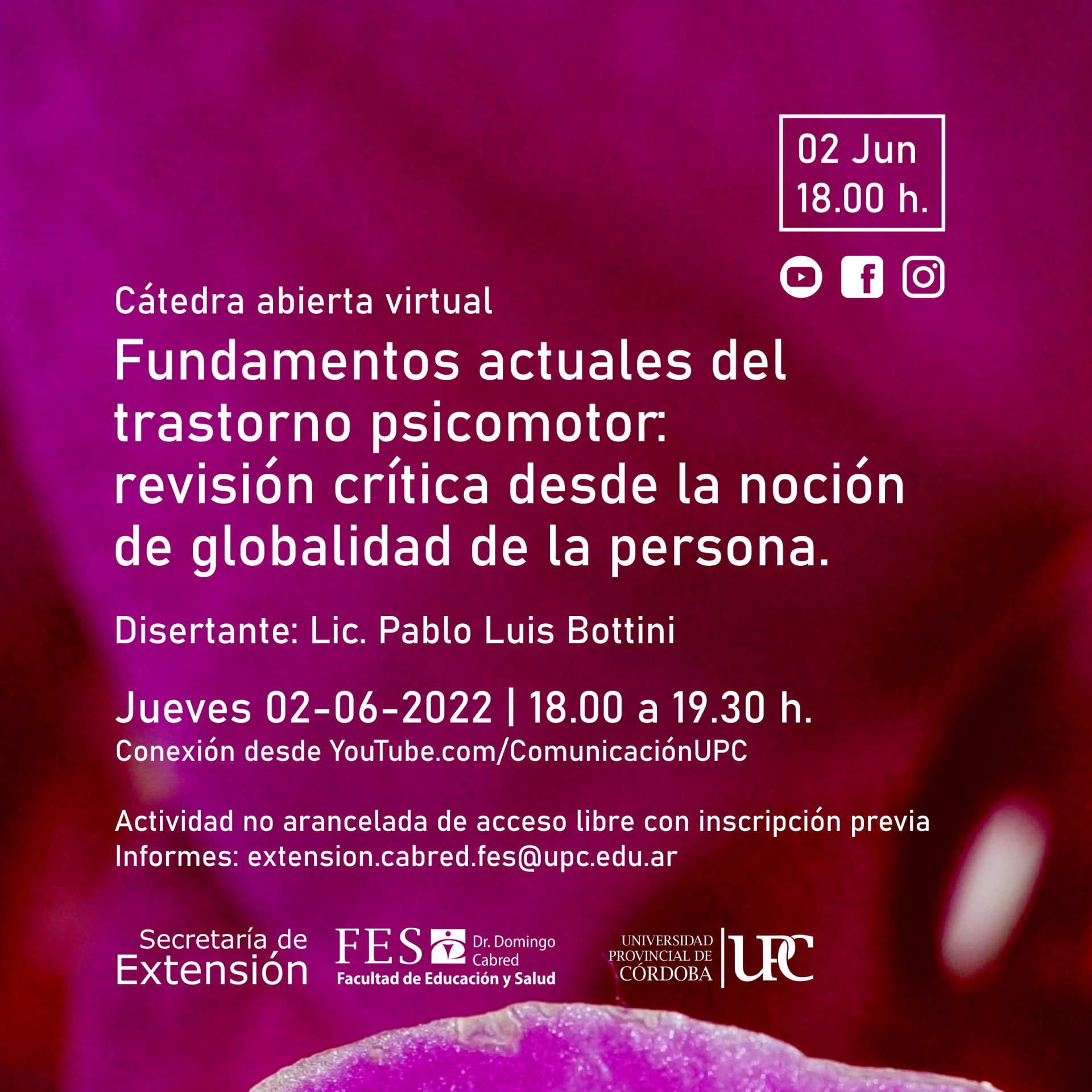 La Facultad de Educación y Salud Dr. Domingo Cabred (FES) de la Universidad Provincial de Córdoba (UPC) invita a la Cátedra abierta virtual, Fundamentos actuales del trastorno psicomotor: revisión crítica desde la noción de globalidad de la persona. La misma se desarrollará el próximo jueves 2 de junio a las 18:00, sin costo y con acceso libre.