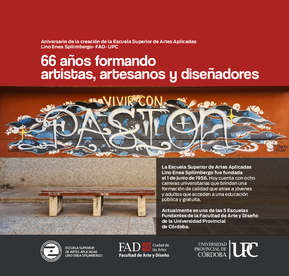 El 1 de junio de 2022 la Escuela Superior de Artes Aplicadas Lino Enea Spilimbergo, -hoy perteneciente a la Facultad de Arte y Diseño de la Universidad Provincial de Córdoba-, cumple 66 años formando artistas, artesanos y diseñadores que hoy nos representan en el país y el mundo.