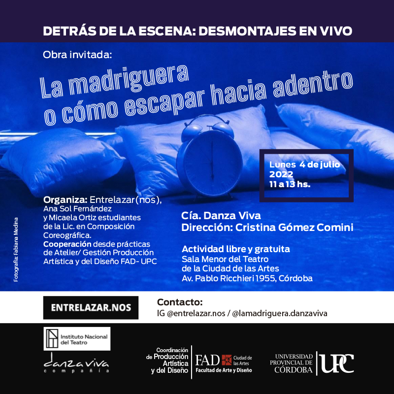 Entrelazarnos es un proyecto que se gestó en la pandemia del año 2020, funciona como un espacio de intercambio a modo de conversatorios en vivo con distintas personalidades de las artes escénicas. Lo coordinamos Ana Sol Fernandez y Micaela Ortiz, estudiantes de la Licenciatura en Composición Coreográfica.