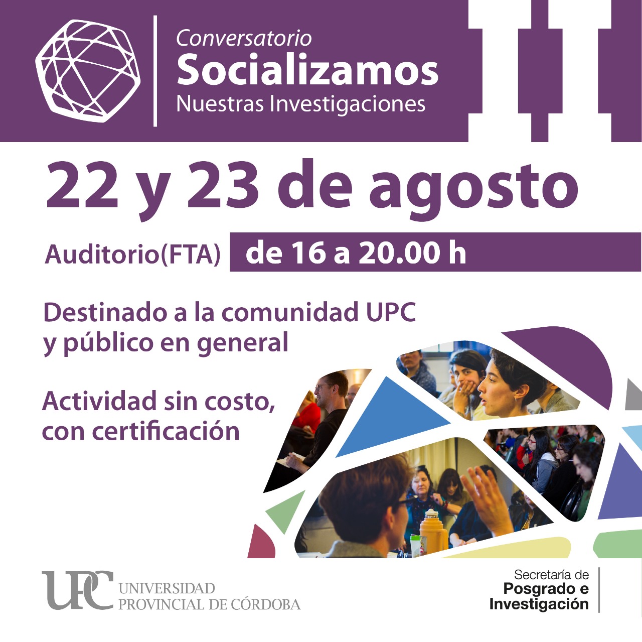 La actividad se llevará a cabo los días 22 y 23 de agosto del año en curso en el Campus Norte de la UPC (Auditorium de la Facultad de Turismo y Ambiente) de 16 a 20 h. El conversatorio está destinado especialmente a la comunidad UPC y abierto al público en general. Las personas interesadas podrán participar como asistentes completando el siguiente formulario de inscripción hasta el 19 de Agosto a las 18 h. La actividad es gratuita y se entregarán certificados.