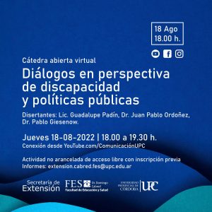 Cátedra abierta virtual “Diálogos en perspectiva de discapacidad y políticas públicas” organizada por el Profesorado Universitario de Educación Especial (PUEE) de la Facultad de Educación y Salud Dr. Domingo Cabred (FES) de la Universidad Provincial de Córdoba en el marco de las XXIX Jornadas Nacionales de la Red Universitaria de Educación Especial (RUEDES) y la XXIII Jornadas Nacionales de la Red de Estudiantes de Carreras y Cátedras de Educación Especial (RECCEE).