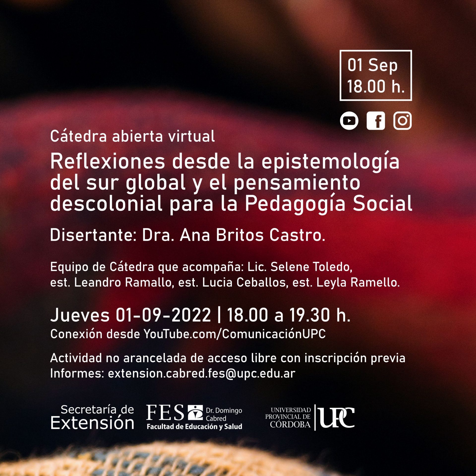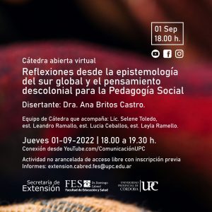 Destinado a: Estudiantes, docentes de todos los niveles educativos, comunidad educativa de UPC, licenciadas/os en Pedagogía social, Sociopedagogas/os, Profesoras/es en menores, referentes barriales, profesionales, público en general, público en general.