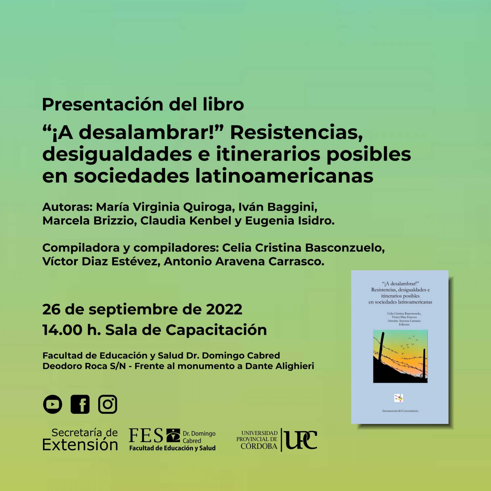 El día 26 de septiembre de 2022 a las 14.00 h. se realizará, en la Facultad de Educación y Salud Dr. Domingo Cabred (FES), la presentación del libro “¡A desalambrar!” Resistencias, desigualdades e itinerarios posibles en sociedades latinoamericanas.