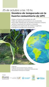 Te esperamos este martes 25 de octubre en la Huerta Comunitaria de la Universidad Provincial de Córdoba, Av. Ricchieri 1955, frente a los atelieres del Campus Sur UPC (Ciudad de las Artes).
