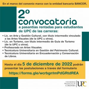 La Secretaría de Extensión y Relaciones Institucionales de la Universidad Provincial de Córdoba se complace en anunciar que se encuentra abierta la Convocatoria a pasantías rentadas en Bancor para estudiantes de la UPC.