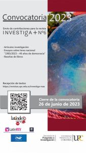 Si bien la revista recepta envíos en cualquier momento del año, el plazo para la presentación de textos a ser evaluados y eventual publicación en el sexto número de Investiga+ (diciembre 2023) vence el 26 de junio de 2023.
