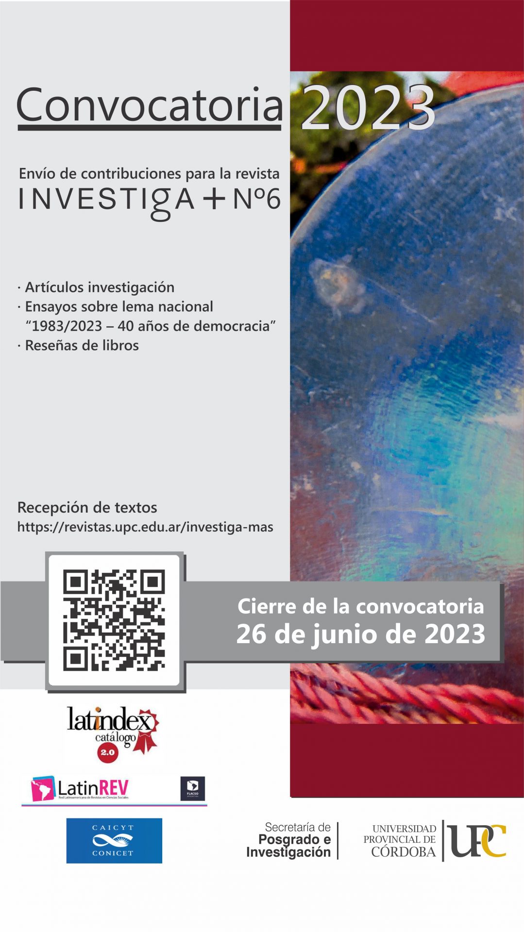 La Secretaría de Posgrado e Investigación de la Universidad Provincial de Córdoba (UPC) informa que se encuentra abierta la convocatoria a la presentación de contribuciones para el Nº 6 de la revista científica Investiga+ de esta universidad. A partir de esta edición, la revista receptará tres tipos de textos. A saber: artículos basados en ensayos teóricos o investigaciones empíricas; ensayos teóricos o investigaciones para la sección “Lema nacional e investigación” según el lema de este año “1983/2023 – 40 años de democracia” y reseñas de libros. Los libros reseñados deben ser de acceso abierto.