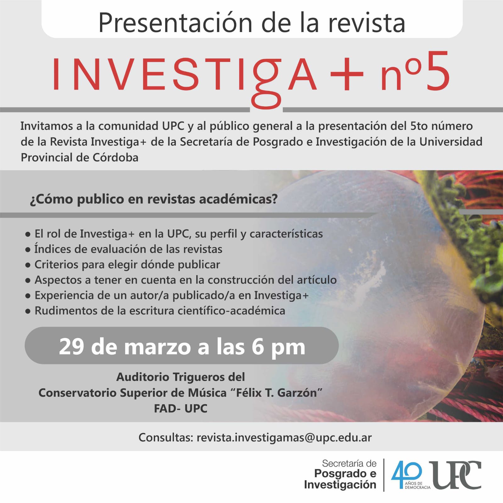 La Secretaría de Posgrado e Investigación de la Universidad Provincial de Córdoba (UPC) invita a participar de la presentación del 5to. número de la revista Investiga+.
