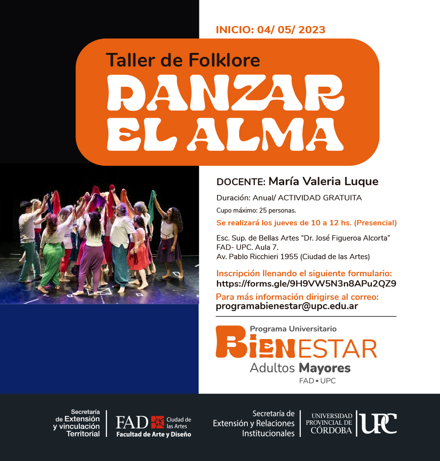 El Programa Universitario para Adultos Mayores «BIENESTAR» de la Universidad Provincial Córdoba abre las inscripciones para un nuevo taller de Folklore “Danzar el Alma” a cargo de la Prof. María Valeria Luque. Destinado a personas de 55 años en adelante.
