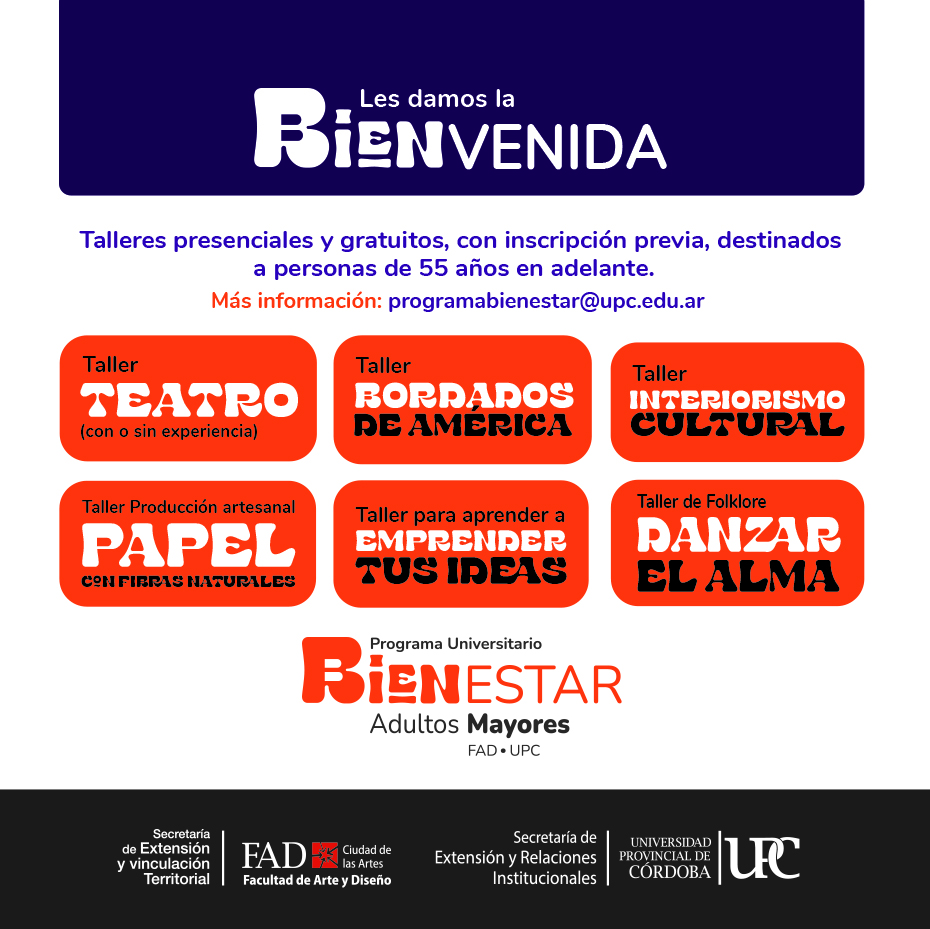 Los talleres son gratuitos y se dictan en la Facultad de Arte y Diseño de la Universidad Provincial de Córdoba – Av. Pablo Richieri 1955.