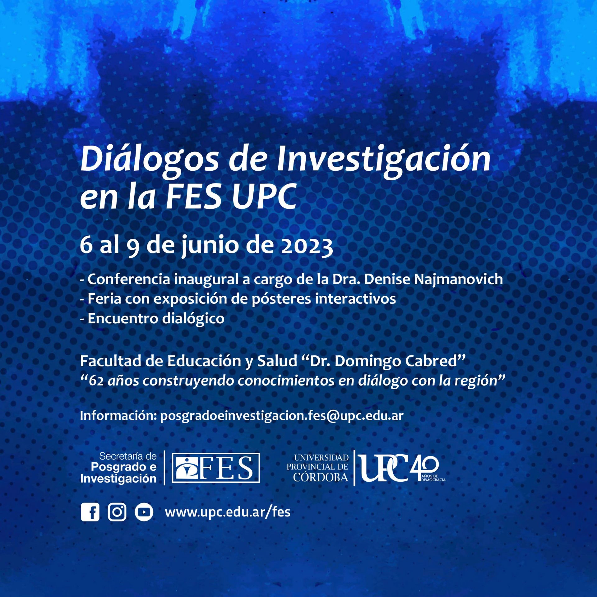 El martes 6 de junio de 17.00 a 18.15 h. se desarrollará la conferencia inaugural “Otras formas de investigación son posibles: de la metodología positivista a las investigaciones dialógicas”, a cargo de la Dra. Denise Najmanovich, en formato presencial y sincrónico con transmisión en vivo por el Canal de YouTube de UPC ingresando desde este enlace.
